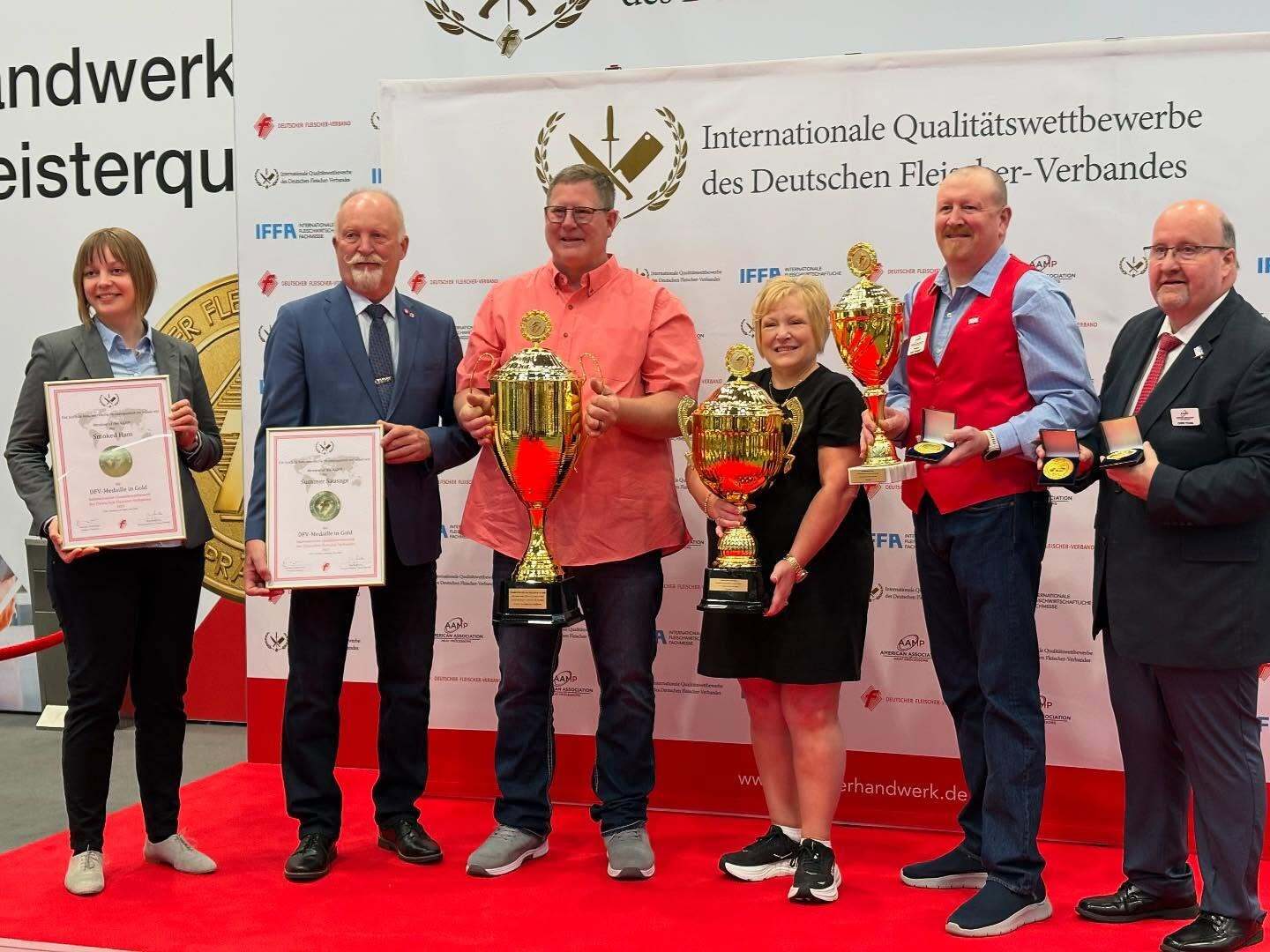 Den's Country Meats accepts awards from the German Butcher’s Association in Frankfurt, Germany.