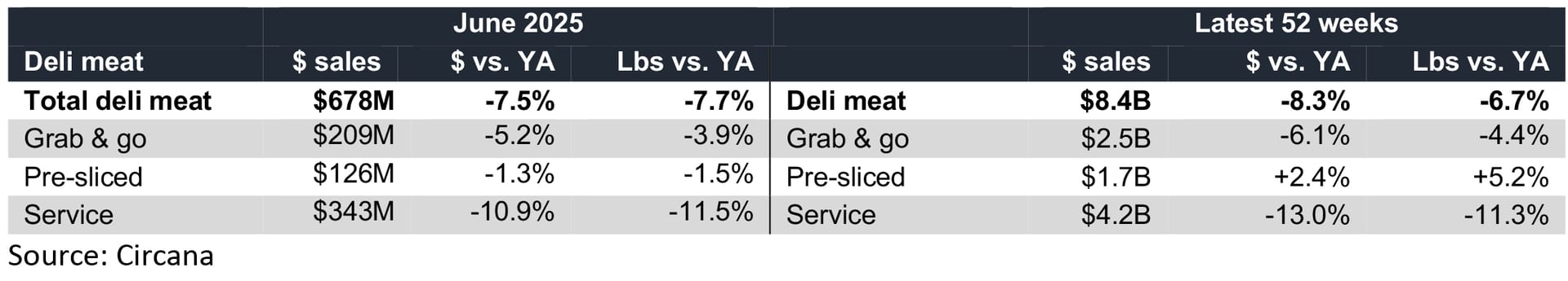 Deli meat sales for June 2025 were $678 million, a decline of -7.5% compared with June 2024 dollar sales. Pounds sold for deli meat were down as well, seeing a -6.8% decline.